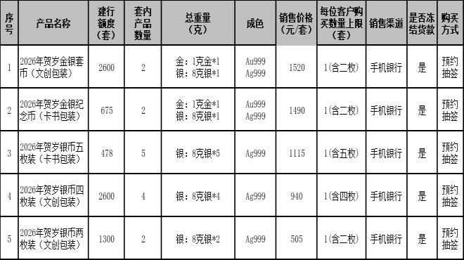 根据中国人民银行贵金属纪念币发行安排,“2026年贺岁金银纪念币”已于近日公告发行,我行根据安排将参与本产品的第二批销售工作。现将有关事项公告如下: